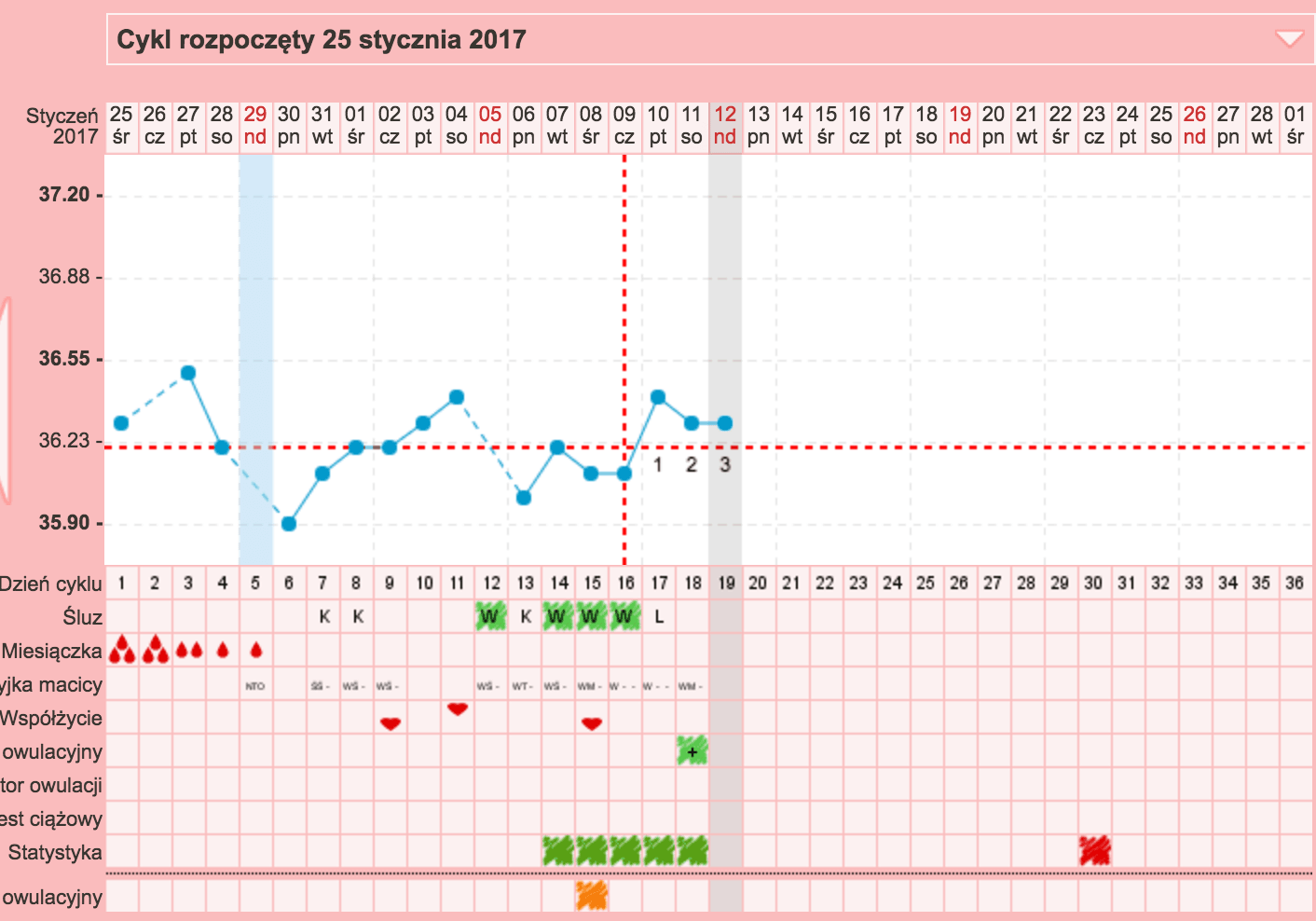 Temperatura dziś 36,10 , brak śluzu, test owulacyjny wczoraj negatywny ( blada druga kreska)