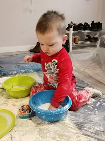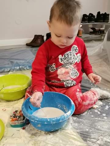 Uznalam ze dzieckiem nie jestem i nie zamierzam sie wybrudzic.. ale zabawa okazala sie tak oddana ze nie szlo odmowic dziecku tej fantastycznej zabawy... Jak z obklejonymi rekoma podczas robienia masy z mleka i maki postanowil sie przytulić do mamy [emoji23]