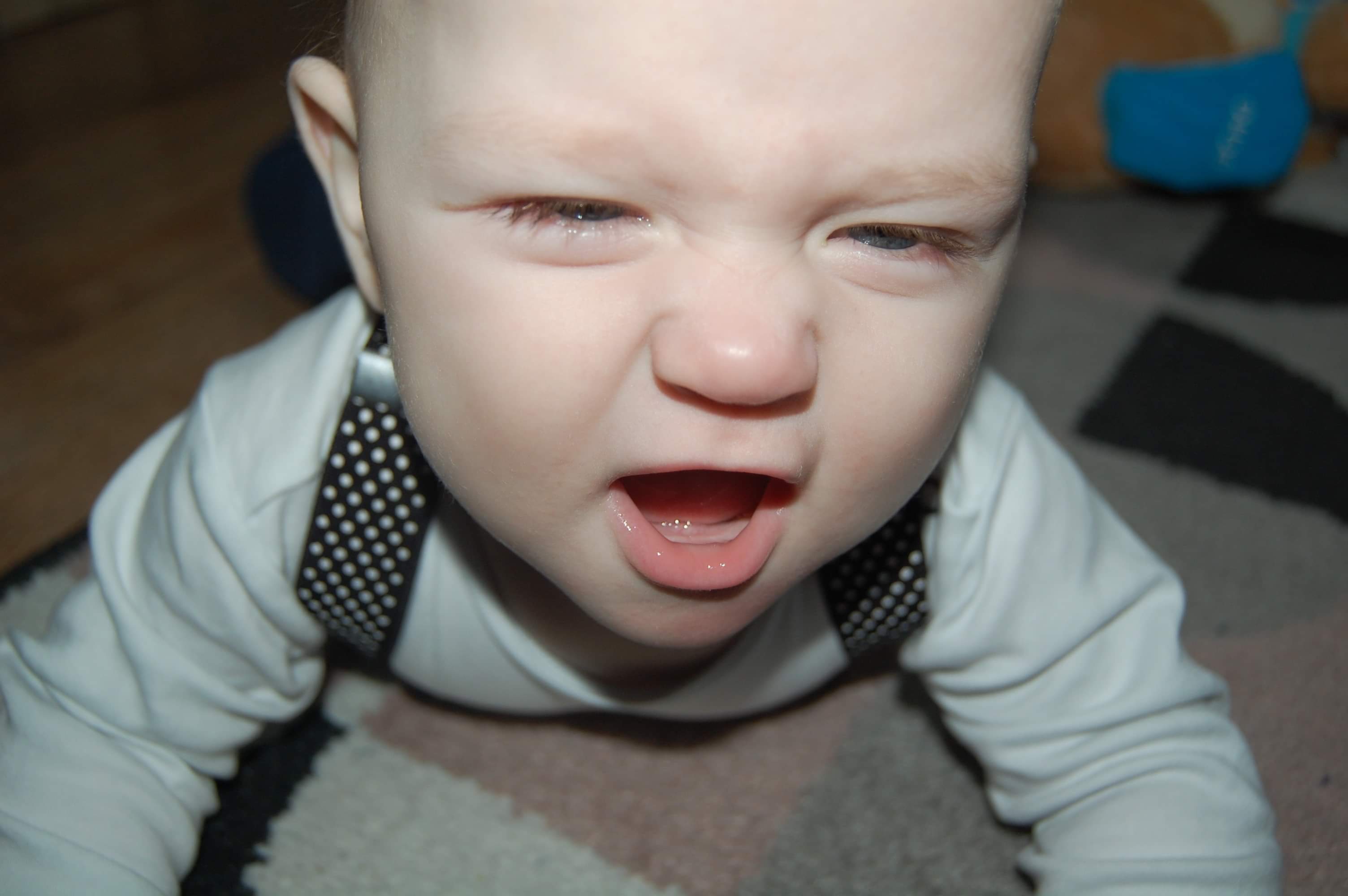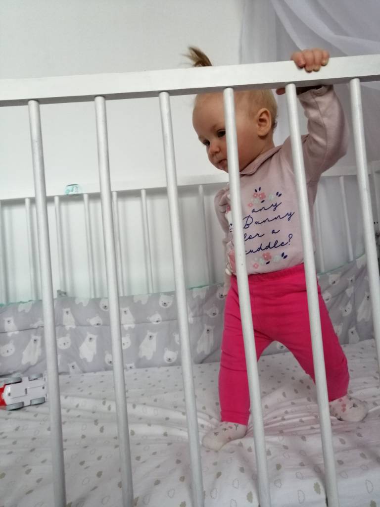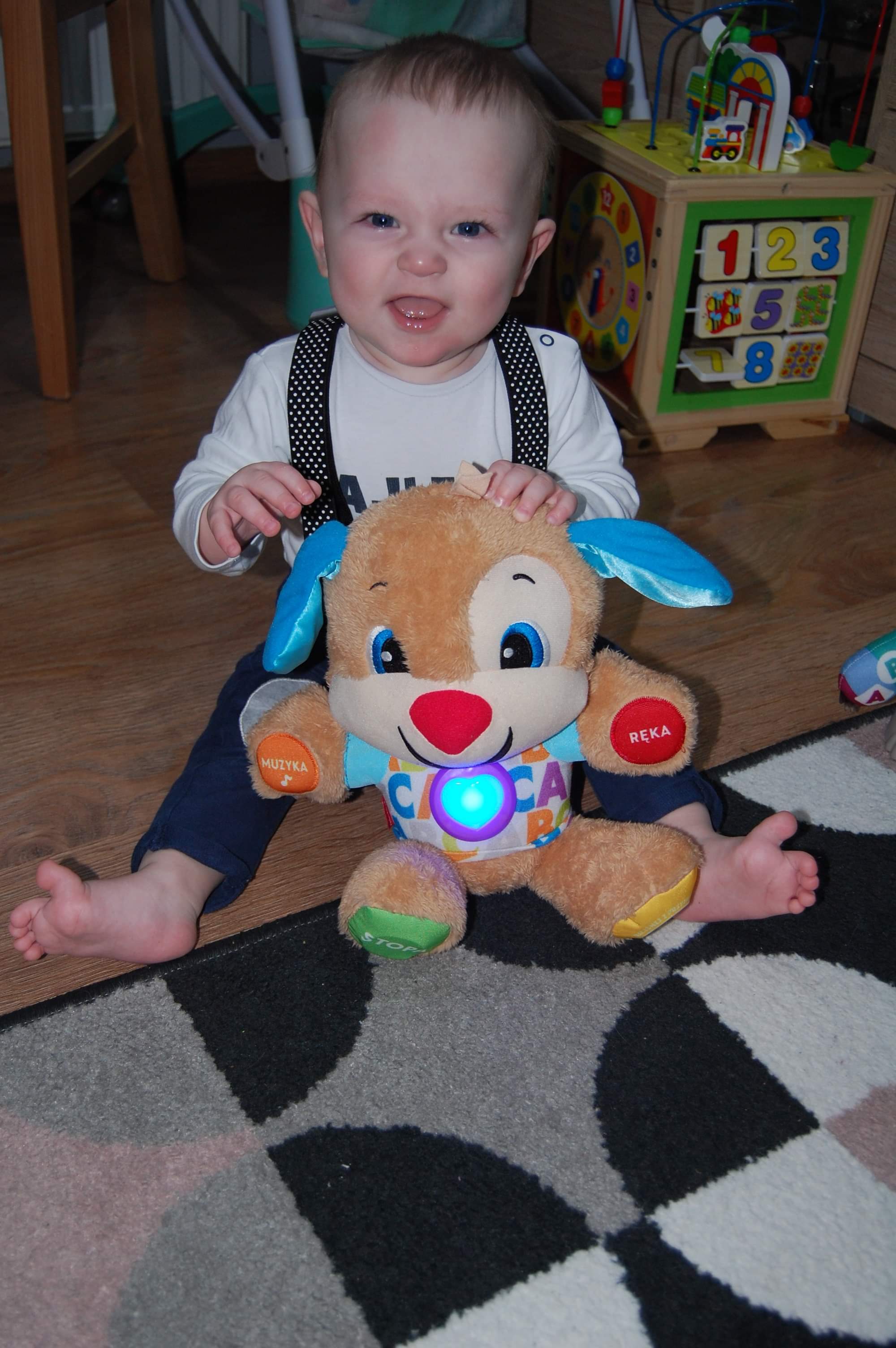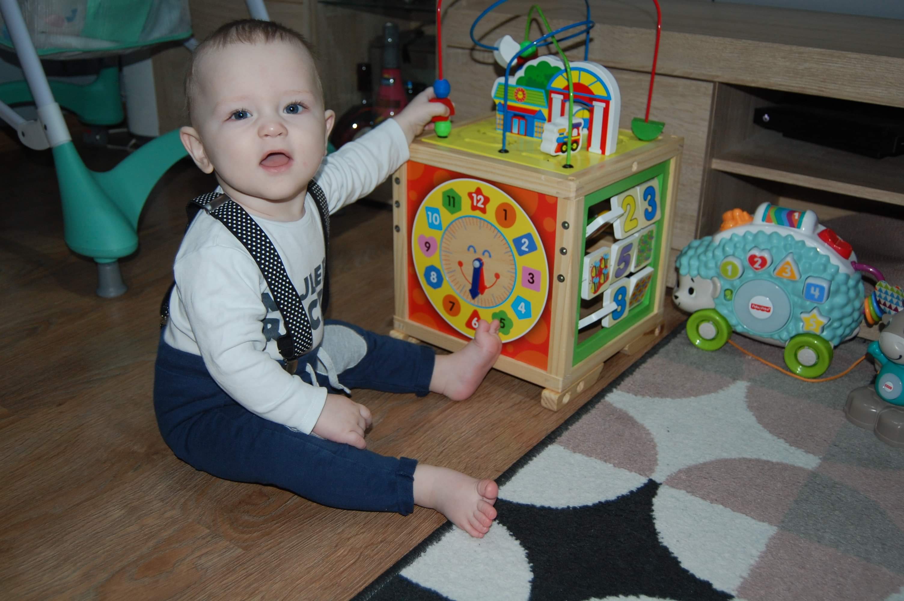 Fifi pełza, raczkuje siada... stoi przy wszystkim i porusza się lewo prawo trzymając przedmiotów. Kilka razy zdarzyło się że niepostrzeżenie stał bez trzymania. Uwielbia grające i świecące zabawki. Na stanie 2 zęby kolejny w drodze.. będzie chyba szybciej niż podejrzewamy. Jest małą beksą.. cokolwiek się puknie od razu płacze. Mówi nadal gaga, doszło parę dni temu dada. Bije brawo i uczymy się robić papa. Pies nada omija go z daleka. Wszystkim wciąż grozi złą minką.