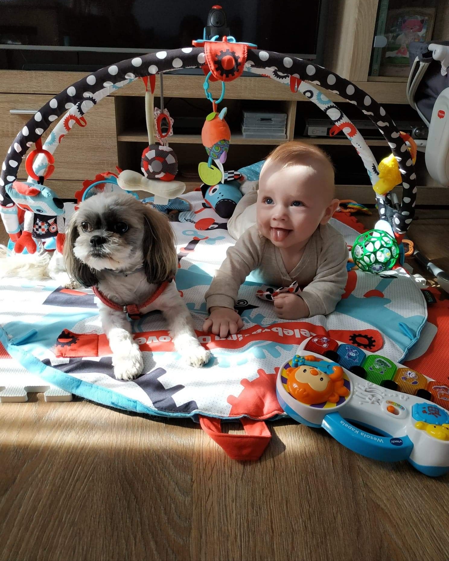 Moj mały to już lobuziak. obraca sie na wszystkie strony, na brzuch na plecy.. Zdążył juz fiknac z łóżka ale kochany dziec. Juz taki swiadomy mozna sie z nim po wydurniac, śmieszy go wszystko a chyba najbardziej nasz pies ktory nie jest zadowolony z obecności Filipa a juz zwlaszcza ze zbyt bliskiego kontaktu