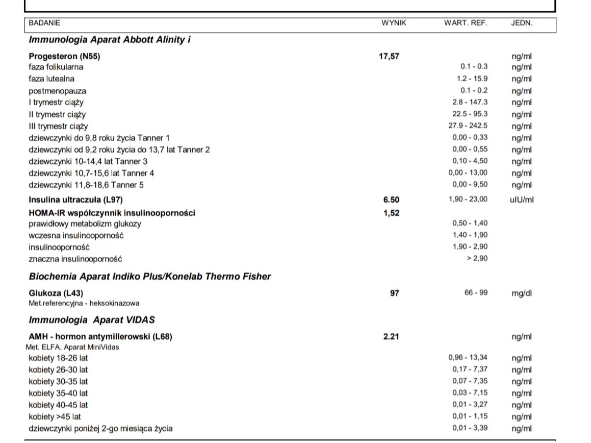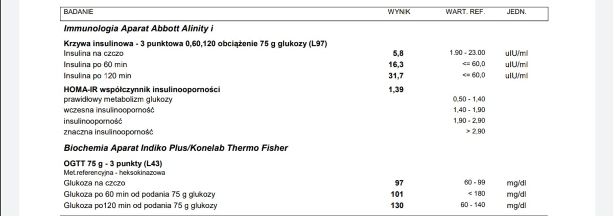 Ja we wrześniu robiłam krzywą i wskaźnik HOMA był na górnej granicy normy,a pozostałe w normie. Po równych 2mcach powtórzyłam tylko na czczo i wskaźnik się ruszył i ja mam takie normy jak w załączniku, czyli już coś się dzieje, a ja czułam to już po sobie. Dziewczyny, same sobie ogarniacie dietę czy gdzieś poszłyście? Ja się źle nie odżywiam, ale mogłoby być lepiej, zwłaszcza biorąc pod uwagę IO, a nie wiem czy sama się tak zmobilizuję...
