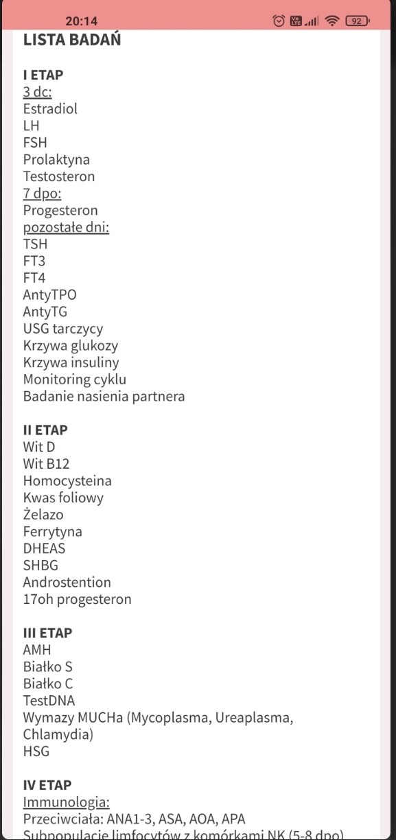 Robiłam podstawowe badania hormonalne, wyszło mi trochę za wysokie TSH ale w jeden miesiąc to zbiłam. Następnie miałam sprawdzaną drożność- wszystko ok. Partner podstawowe badania nasienia oraz HBA i stres oksydacyjny- również dobre wyniki. Chodzę co miesiąc na monitoring owulacji. Dostaje zastrzyk na pęknięcie (chociaż nie miałam z tym problemów), a następnie na 14 dni progesteron (również nie miałam zaniżonego wyniku, ale to chyba „standardowa procedura” u tego lekarza. Nie dyskutuje czy to słuszna droga, bo nie mam wystarczającej wiedzy). We wtorek idę znowu i z tego co sugerował, powinnismy rozważyć inseminacje
