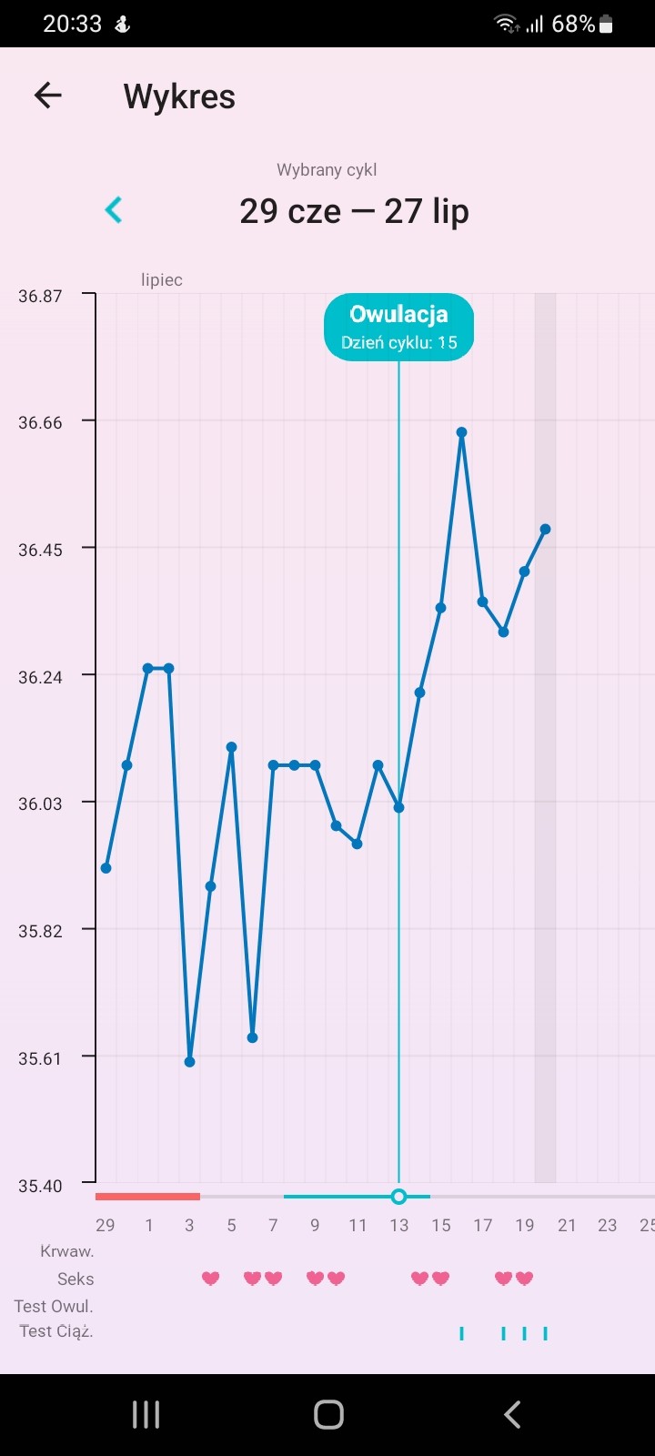 Bardziej po prostu zastanawiam się nad tą temperaturą w sensie czy ona powinna po owulacji już być stała i potem spaść na okres. Czy może skakać i to też jest okej