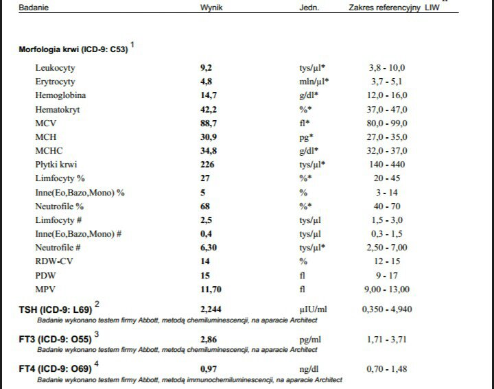 Nie mialas wogole anty tpo i anty tg. Pamietam Twoje wyniki bo jeszcze Ci pisalam ze dobre sa, chyba ze zle spojrzalam juz nie wiemHmm no ja oba miałam wysokie, anty tpo chyba miałam ponad 800, laboratorium nie mierzy już więcej, to był max... Mogę mylić z anty tg, ale na pewno któregoś z tych dwóch miałam aż tyle... A drugie było jakoś też sporo powyżej normy. To było ponad rok temu, albo prawie 2 lata i nigdy więcej już mi tych badań nie powtórzono...