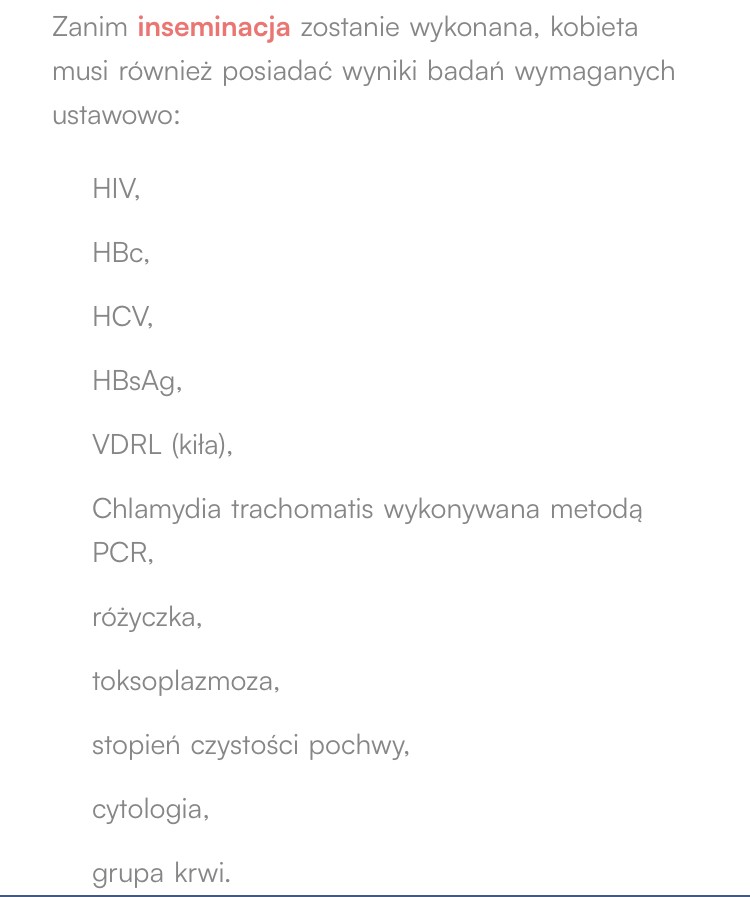 Ogólnie tak jak mówisz - dostaniesz to zrobienia badania i wymazy ( z tego co pamiętam wymazy MUCHa,) musisz mieć aktualną cytologię też. Na początku cyklu dostajesz ewentualne leki na stymulację (ja nie miałam) Potem gin Ci zaleca w którym dniu cyklu przyjść na pierwszy monitoring i w zależności co tam się dzieje i jak rośnie wyznacza kolejne. No i jak jest na monitoringu już odpowiedni pęcherzyk to albo dostajesz zastrzyk na pęknięcie, albo nie, jeśli masz swoje ładne owulki i lekarz tak zdecyduje. No i lekarz mówi Ci kiedy masz przyjść na inseminacje. Przychodzicie z partnerem, on oddaje nasienie, potem czekacie 2h aż je przygotują, idziesz do salki, podają Ci nasienie do macicy, leżysz 10 min, idziesz do domu.Czy mogłybyście napisać jak to wszystko po ogólnie wygląda ? Wiem, że jakieś badania są zlecone, potem monitoring owulacji i z tego co ginek mi mówił to możemy się zmieścić w jednym cyklu. Mój problem jest taki, że mam super gineka, ale odpowiada zdawkowo + ja mieszkam za granicą i specjalnie będę musiała przyjechać do Pl na zabieg. Zastanawiam się czy to się odbywa w szpitalu czy nie lepiej iść do prywatnej kliniki ? Bo i tak nie mam ubezp.