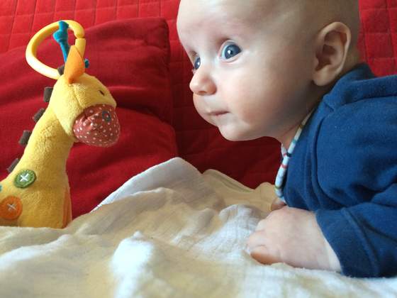 Ćwiczymy podnoszenie na rączkach, wczoraj nawet przewrócił się z brzuszka na plecy ale akurat nie widziałam bo spryciarz zrobił to macie jak byłam w kuchni.