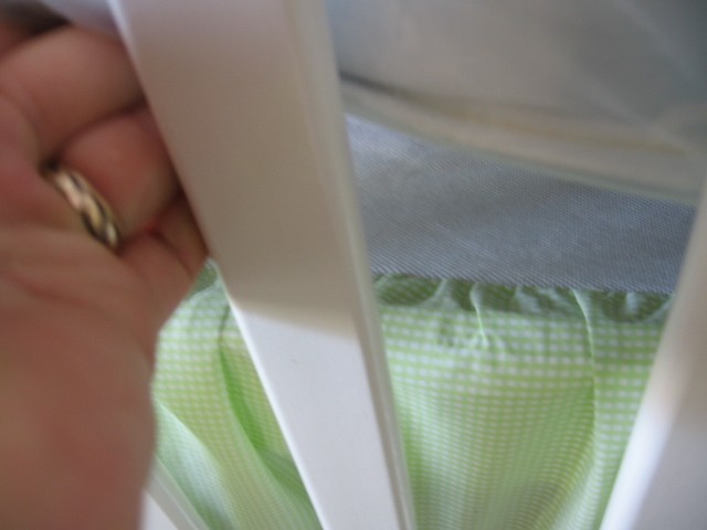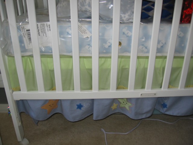 Sylka - falbana wyglada tak. teraz jest lekko przykrotkawa dlatego ze materac jest podniesiony do gory. Jak mala podrosnie i materac bedzie we wlasciwej pozycji, falbana siega do podlogi i zaslania wszystko co jest pod lozeczkiem. Instaluje sie ja pod materac a na materac przychodzi przesieradlo. Pod materacem jest bialy material a do niego jest doszyta wlasnie wystajaca czesc - czyli ozdobna falbana. Mam nadzieje ze w miare czytelnie to pisalam?