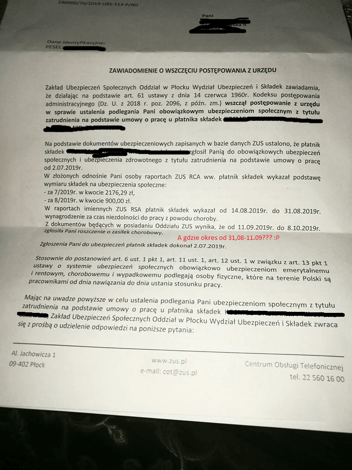 Z tego pisma wynika, ze zaczęłaś prace 02.07.2019. I po około 1,5 miesiąca poszłaś na l4. ZUS kontroluje zatrudnienie rozpoczęte niedługo przed l4 a już wogole ciążowym aby wykluczyć fikcyjne zatrudnienie w celu wypłaty zasiłków. Moja koleżanka miała kontrole i sprawdzali wszytsko. Pytali współpracowników czy faktycznie pracowała czy ja widzieli, maile służbowe itp