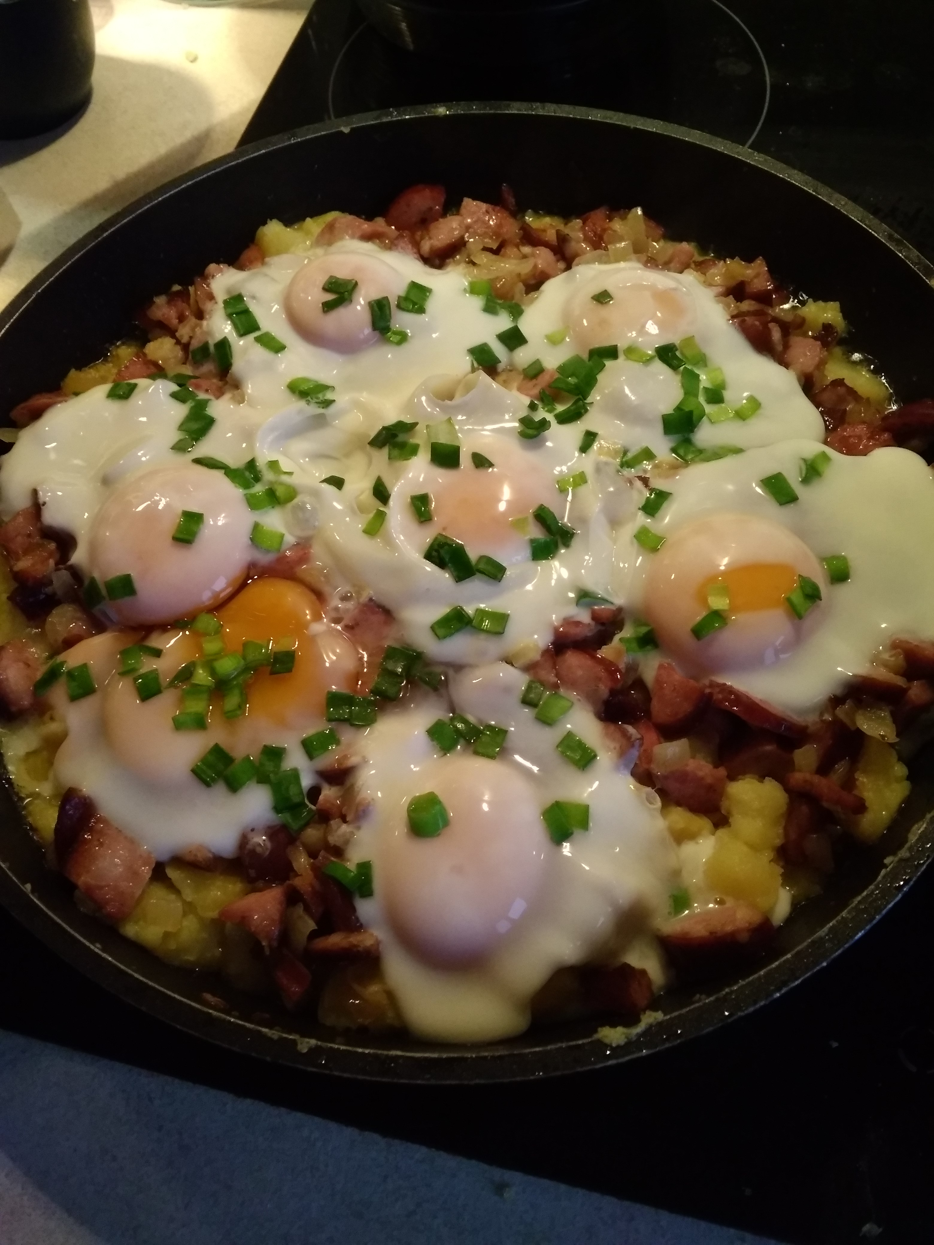 Smażyć się kiełbaskę z cebulką ( ja najbardziej lubię wędzony boczek ale mój mąż go nie znosi) i zdejmuje na talerz. Na tej samej patelni kładę ziemniaki pokrojone w plasterki z poprzedniego dnia przeznaczam chwilkę na to ta kiełbasa z cebulką ( można dodać ząbek czosnku) i na to jajka wlewam, sole pieprzę i przykrywam na moment żeby jajka ścięły się z wierzchu a w środku były ciekłe. Posypuje szczypiorkiem i jestmożna też do kiełbasy i cebuli dodać trochę papryki
