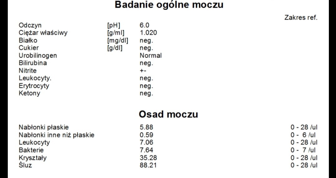 Mi wyszło w moczu, że mam trochę bakterii ale niewiele ( u Ciebie też wynik raczej wskazuje, że raczej nie jest to potężna infekcja) i ginekolog powiedział, że mam zapomnieć. Przy małej ilości bakterii, co jest ponoć prawie normą w ciąży, nie ma sensu tego tępić antybiotykami ale pić 3 L płynów dziennie i zakwaszać cytrusami itp. Oczywiście nie neguję potrzeby przyjmowania antybiotyków - jeżeli kobieta ma objawy zakażenia pęcherza, boli ją, bakterii jest sporo pewnie trzeba wtedy brać antybiotyki.Dziewczyny możecie mi powiedzieć czy ten wynik moczu jest dobry? Zastanawiam się bo widzę że mam tam coś podwyższone i jakieś bakterie...