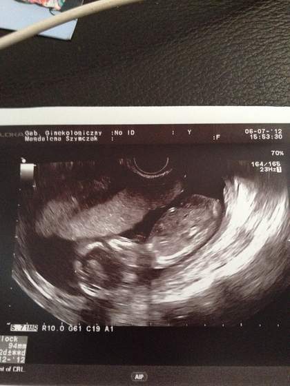 No więc u mnie po badaniu w skrócie wygląda tak: moje dzieciątko ma 5,57 cm długości, przezierność 0,8 mm, kość nosowa jest, serduszko bije 164 uderzenia na minutę. Ogólnie lekarz stwierdził, że wszystko jest w normie. Tylko maluch za bardzo nie chciał współpracować, wypiął się i spał, jak go lekarz próbował pobudzić to tylko nóżką kopnął, ręką machnął na to i dalej spał:-D Miałam cichą nadzieję, że coś o płci się dowiem ale niestety moje dziecko postanowiło trzymać nas dalej w niepewności;-)