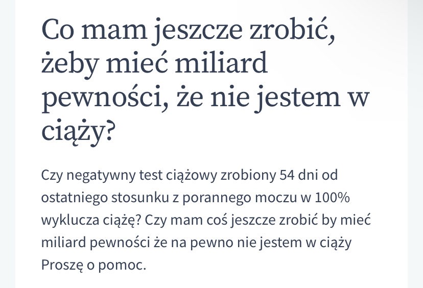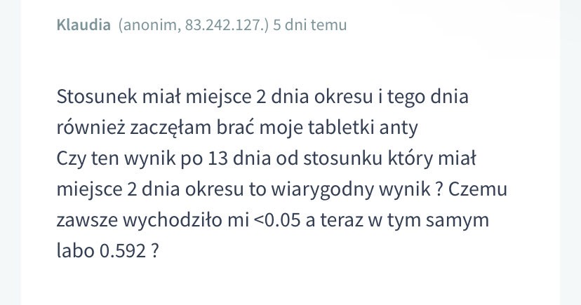 widziałam tam tez pytanie czy może być ciąża 60 dni po stosunku „czy jeżeli w grudniu był ostatni stosunek to czy mogę być w ciazy”Teraz patrze to na stronie,, gdziepolek ,,, gdzie odpowiadają farmaceucji zadał ktoś takie same pytanie tabletki anty + beta 0.14 .... Więc chyba ktoś ma poważne zaburzenia , jak ktoś nie wierzy becie to nie wiem niech odczeka 8 miesiacy i zobaczy czy brzuch rośnie, albo to faktycznie troll bo to aż już nudne się robi