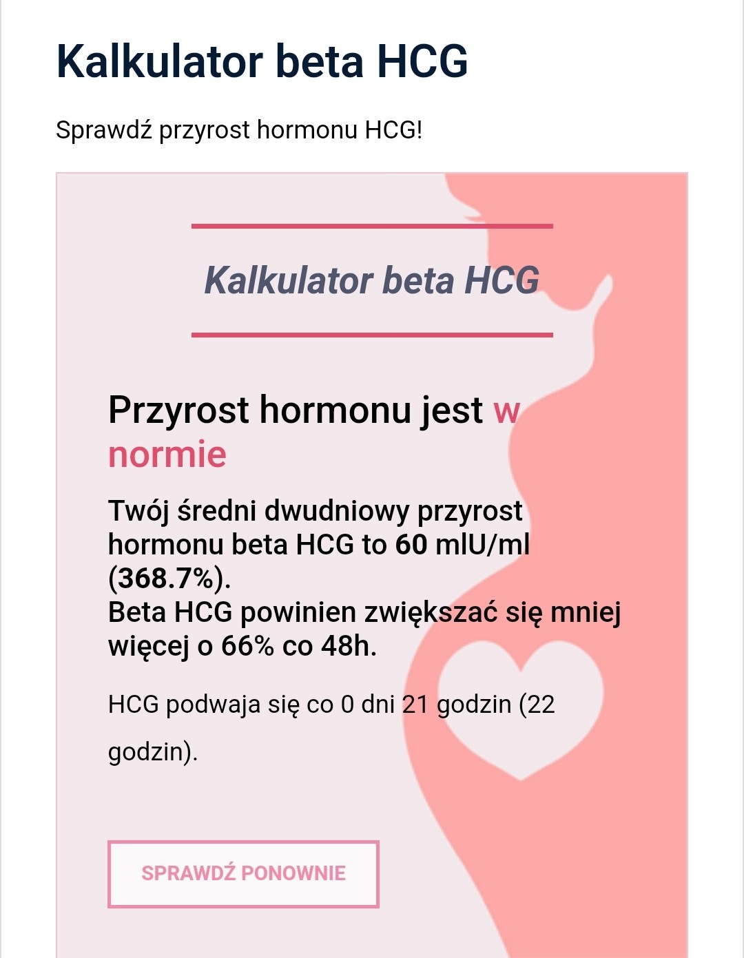 beta powinna się podwajać co 48 h, także według kalkulatora przyrostu u Ciebie jest 368.7% czyli jest dobrzeDziewczyny zrobiłam dziś bete