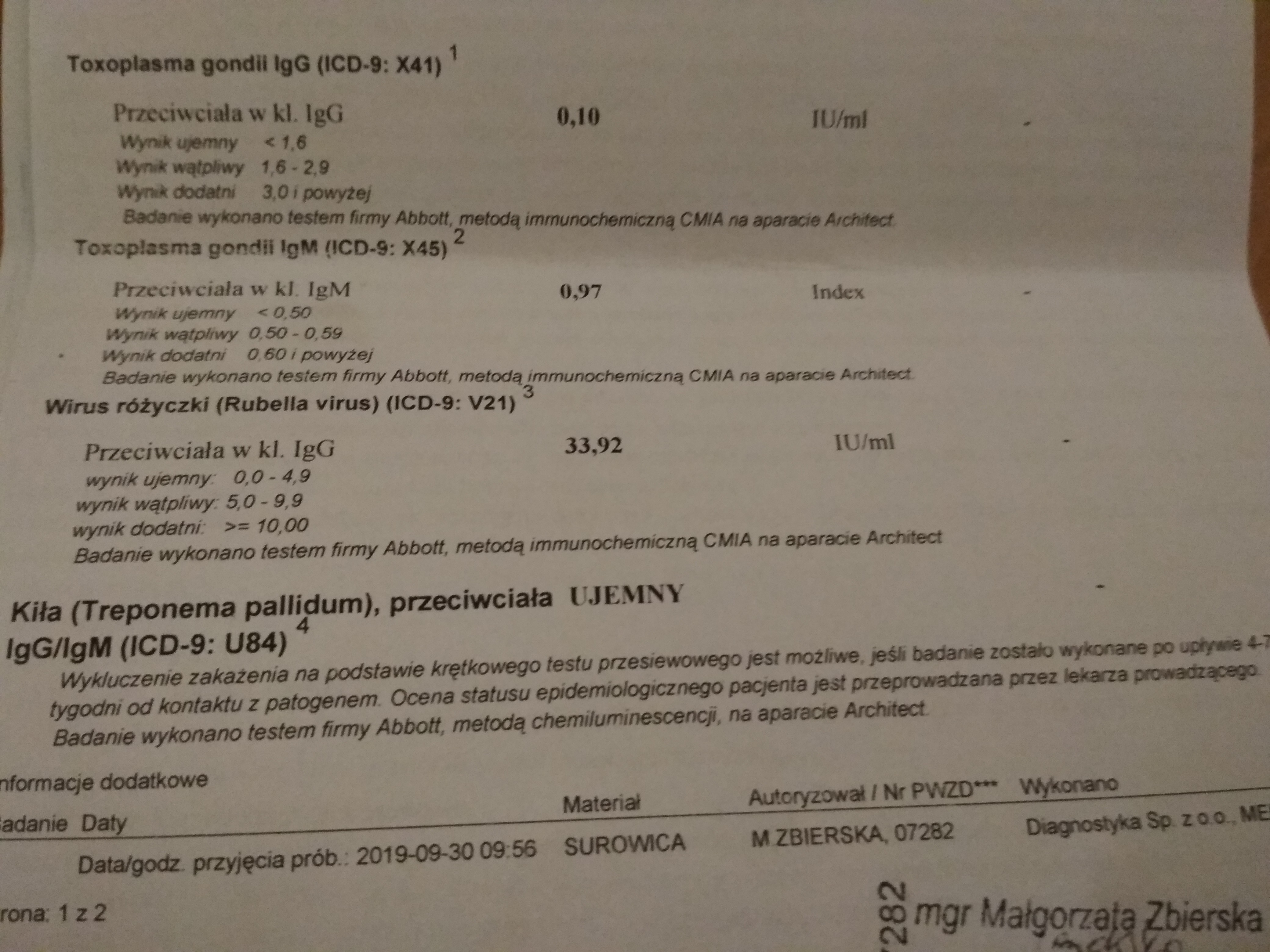 Witajcie dziewczyny,zrobiłam badanie na toksoplazmozę,IgG ujemne(0,10),IgM dodatnie(0,97)lekarz u którego byłam na pierwszej wizycie nie widząc wyników podałam mu jednostki smsem ,stwierdził że jestem chora i mam szybko wykonać awidnosc która wykaże mi czy zaraziłam się przed czy w trakcie ciąży.Drugi lekarz u którego byłam na wizycie z wynikami powiedział że raczej nie widzi toksoplazmozy ,że awidnosc nic mi nie wykaże bo jest na to za wcześnie,mam powtórzyć badania za 3 tyg,wtedy się wyjaśni.Najgorsze to czekanie,nic nie możesz zrobić,a dziecko z dnia na dzień się rozwija....czy miałyście podobną sytuację,podobne wyniki?co na to Wasz lekarz?