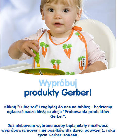 Dla mam dzieciaków powyżej 1 roku życia promocja Gerbera na FB. Trzeba polubić profil Gerbera i zaglądać na Tablicę. Co jakiś czas są promocje i można testować posiłki :)