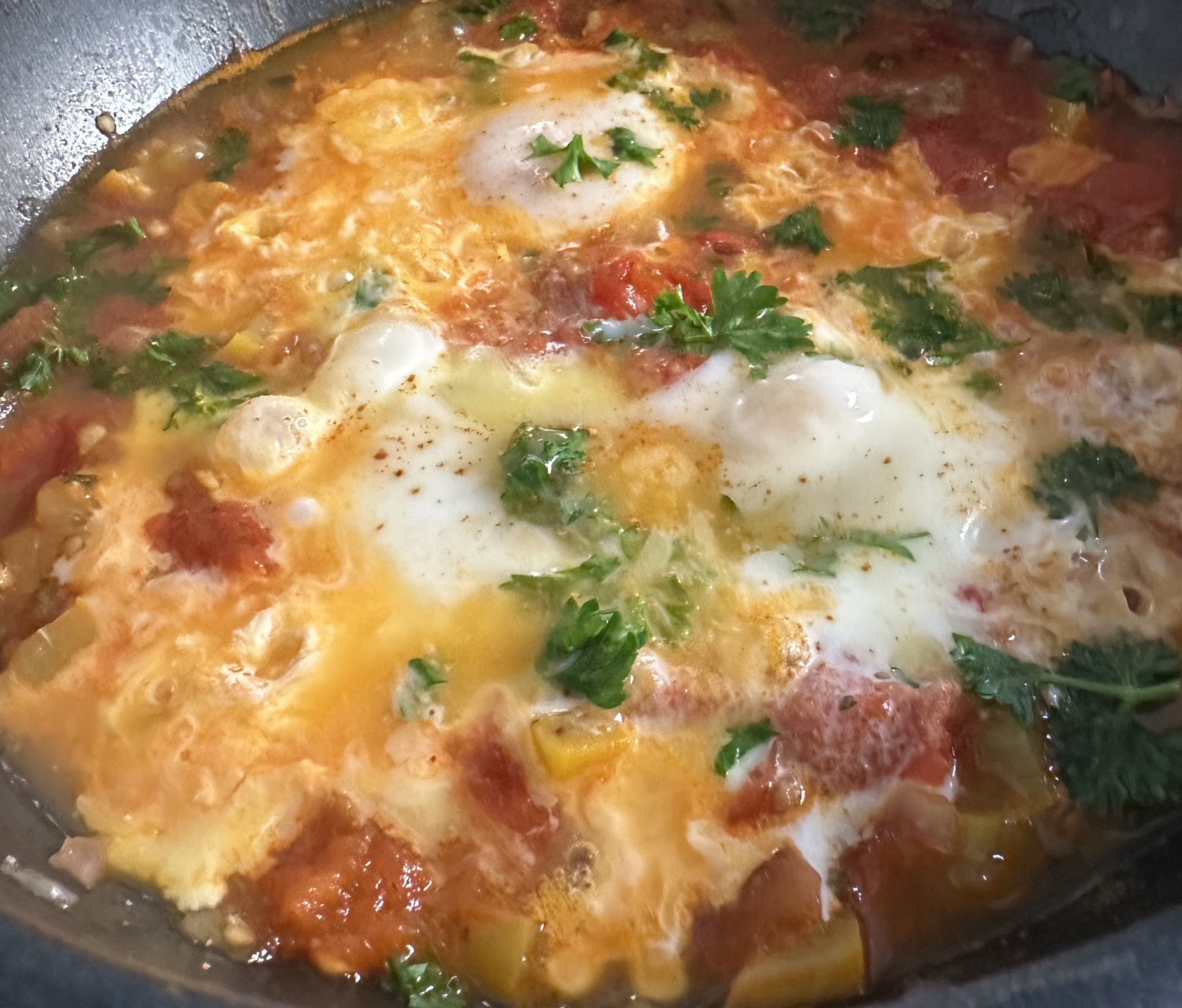 Tak się wkurzyłam na ten ból brzucha, ze zrobiłam shakshuke( jaja specjalnie”rozłalam” po patelni bo nie lubię jak mi żółtko „pływa” 😂)