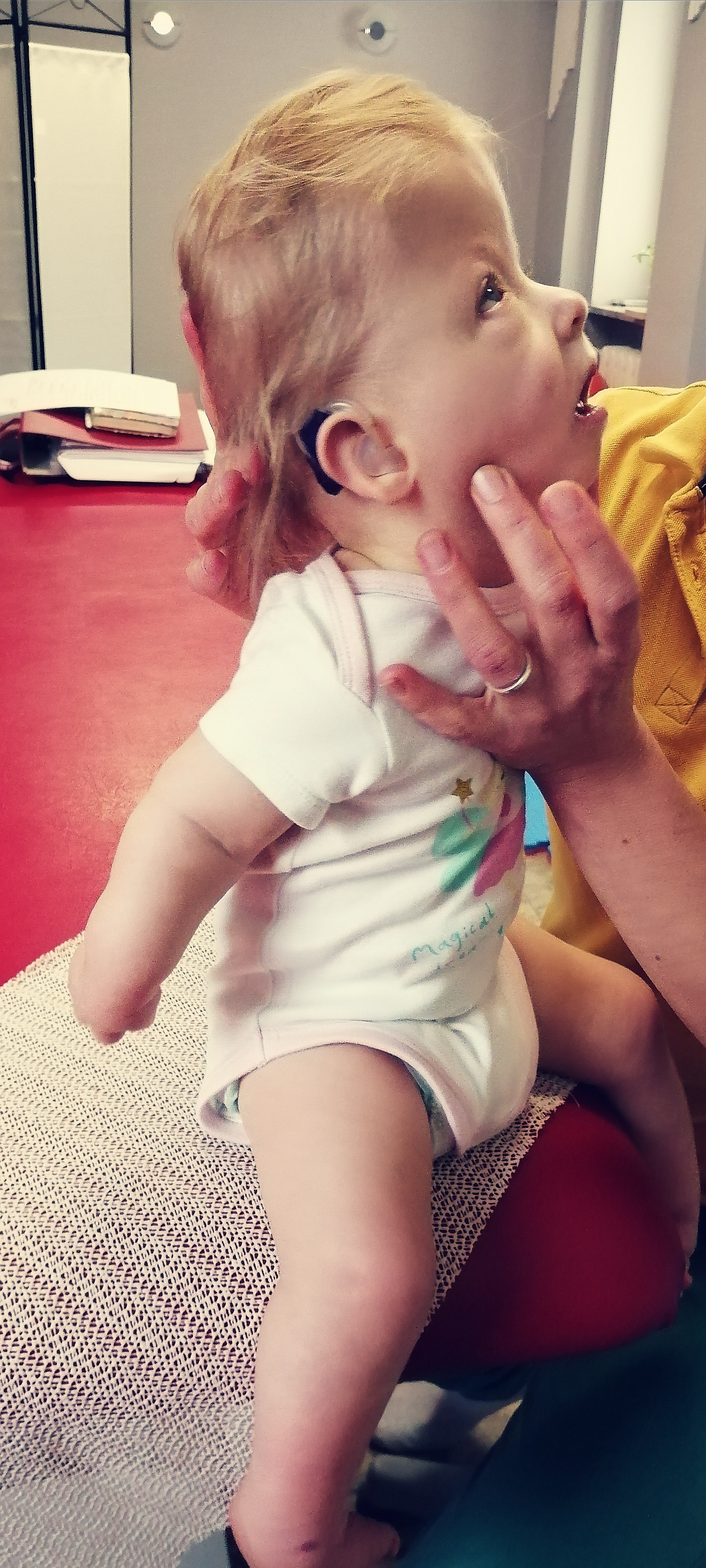 *Dowiedziałam się też, że Tosia powinna chodzić do surdologopedy. To ktoś, kto zna się na pracy z dziećmi niesłyszącymi. Wcześniej nie słyszałam nawet tego słowa... Od jakiegoś czasu zaczęłam się martwić, że nie ma poprawy, rozwoju mowy w aparatach. Nie umie powiedzieć "a gu" tylko wydaje zduszone, gardlowe dźwięki. A widzę, że próbuje, majstruje językiem, patrzy mi w oczy i chce coś powiedzieć... Zaczęłam szukać, czytać, o co chodzi.... A chodzi o to, że powinniśmy mieć inne podejście i dużo pracować z Tosią - ze słuchem. Oczywiście NIKT mi tego nie powiedział. Zresztą jak ze wszystkim, muszę dogrzebac się sama. Nie jestem osobą roszczeniową, nie o to chodzi. Jednak jeżeli np. Chodzę z Tosią do protetyka słuchu tygodniami, do laryngologa, kupiliśmy u nich aparaty za 11 tysięcy zł, to mogliby powiedziec, że z dzieckiem trzeba chodzić na terapię do kogoś takiego jak surdologopeda!?