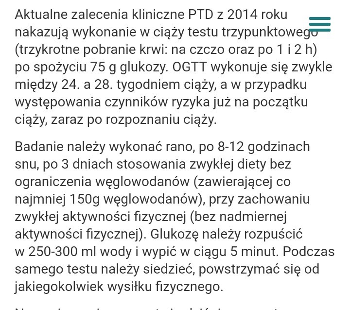Dziewczyny czy do doustnego testu tolerancji glukozy trzeba się jakoś przygotować? Z tego co czytałam to istotne tylko żeby ostatni posiłek byl 12h przed badaniem i żeby to nie były owoce/słodycze. Witaminy można normalnie brać? O 22 biorę duphaston i fraxyparyne, to jakoś wpływa? Pisze na necie żeby nie zmieniać diety przed badaniem, a potem jest napisane np żeby przez 3 dni nie pic herbaty, kawy itd dlatego pytam Was bo jesteście bardziej doświadczone