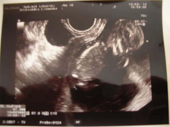 "Zmolestowałam" moją Panią doktor, żeby "skoro już tu jestem" zrobiła mi usg - tak na uspokojenie nerwów chciałam zobaczyć, że serduszko puka. Pani doktor się zgodziła (pomimo iż już miała 30 min opóźnienie w kolejce, a formalnie wskazań nie było, bo widziałyśmy się niedawno i brak krwawień, itp). Podpatrzyłam sobie bobaska, a pani doktor przy okazji wymierzyła wszystko dokładnie (i tak chcąc, nie chcąc trafiłam przypadkiem na badanie przesiewowe, "bo skoro już tu jestem" ;-)). Wszystko w normie, bobasa podpatrzyłam z wszystkich możliwych stron i wyszłam z gabinetu bogatsza o dwa zdjęcia: