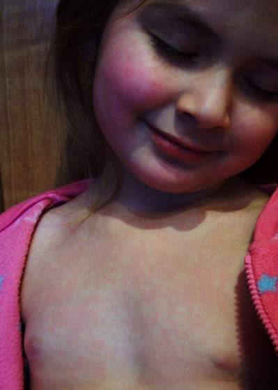 W czwartek Tomek poszedł ją kąpać i mnie woła, żebym przyszła zobaczyć, bo Oliwce jakieś uczulenie wyszło. Przyszłam i odrazu sobie skojarzyłam, że pojawiła się u nas w przedszkolu szkarlatyna. Wysypka co prawda dość skąpa i jasna była, lekarka narazie powiedziała, że diagnoza jest pod znakiem zapytania, bo wysypka wcale nie taka typowa na szkarlatynę i gardło za ładne, no ale antybiotyk dała, bo nieleczona szkarlatyna ma bardzo poważne powikładnia. Dziś już Oliwkę wysypało konkretniej, kaszle, ale na gardło się nie skarży i nie ma w ogóle gorączki - ma 36,5 st, nawet najmniejszego stanu podgorączkowego, a ponieważ czuje się dobrze, to ma zdecydowanie za dużo energii jak na zamknięcie na kolejny tydzień w czterech ścianach. Lekarka powiedziała, że choroba się potwierdzi, jak pojawi się charakterystyczne łuszczenie skóry, ale ja tam już jestem pewna... W sumie to powiem Wam, że nie narzekam, że zachorowała - przechodzi bardzo łagodnie, gdyby nie wysypka, to w ogóle nie zorientowalibyśmy się, że jest chora (tak samo było przy ospie).Załączniki