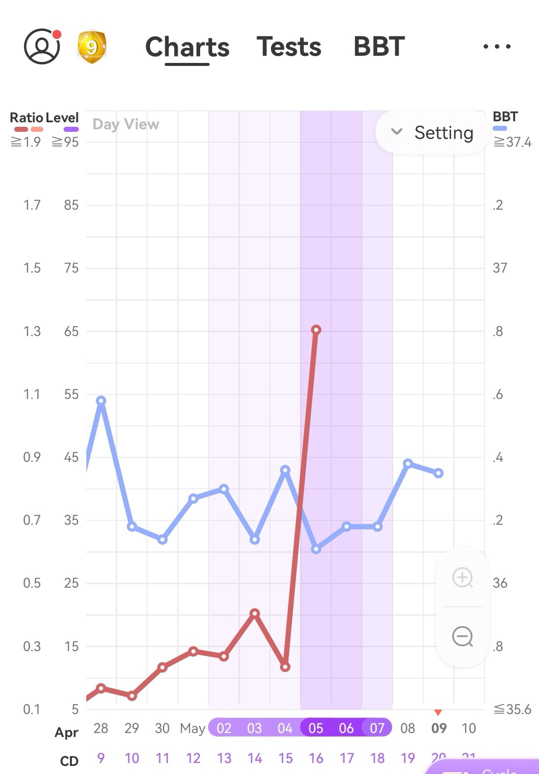 Ja widzę, że mamy prawie identyczną sytuację. Że gdyby nie ta troszkę wyższa temperatura 4.05, to ten skok po zaznaczonej przez Premom owu (u Ciebie 8.05, u mnie 9.05) byłby zaznaczony jako BBT spike i pojawiła by się kreska oddzielająca fazę temperatur niskich od wyższychCoś wisi w powietrzu, bo mi temperatura też skoczyć nie może