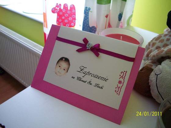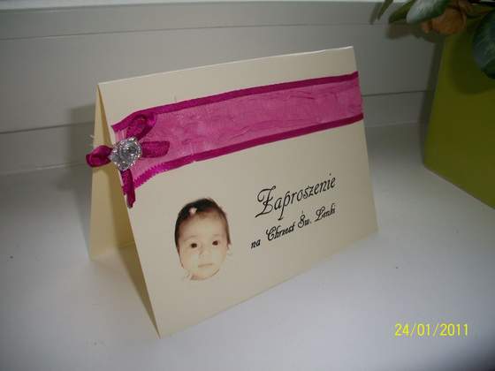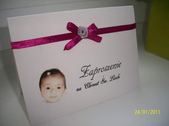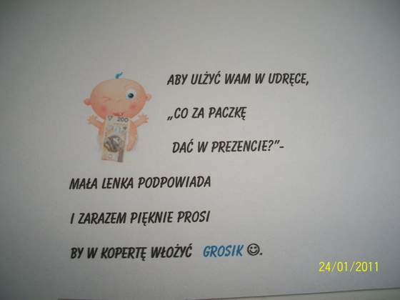 Magi, nic nadzwyczajnego. Po prostu chciałam zrobić je samodzielnie, a że mam czas...:-)A wśrodku prócz tekstu zaproszenia na osobnej karteczce taki oto wierszyk. A to dlatego,że goście pytają nas co kupić małej a my na to że zbieramy kasiorkę dla Bąbla. Moja rodzinka ma poczucie humoru więc ośmieliłam się trochę zmodyfikować tekst:-)trochę się napociłąm ale jest już gotowe, od A do Z moje wykonanie:-)