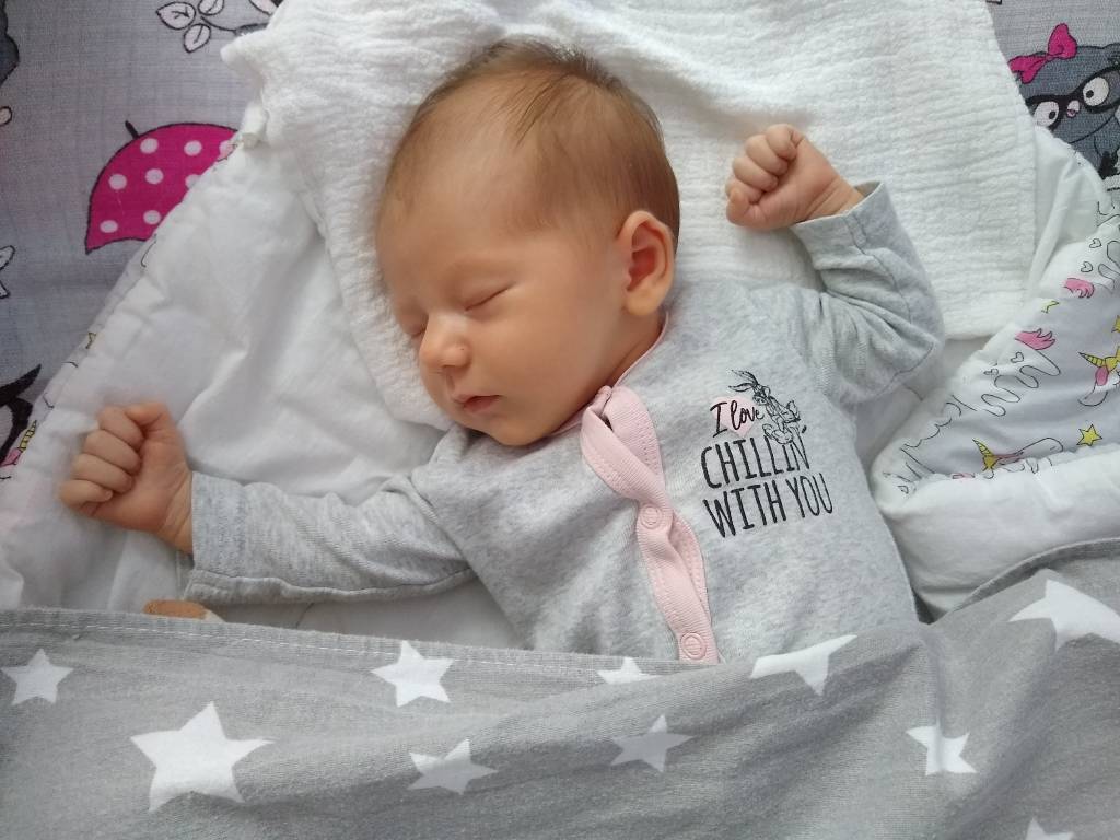 Wczoraj spała ciągiem prawie 6 godzin, w nocy też tylko 2 krótkie przebudzenia na szybkie bezproblemowe przewinięcia (bo zazwyczaj w nocy przynajmniej 2 komplety ubranek szły do kosza na pranie, a wczoraj żadnego osikiwania się w chwili gdy brudna pielucha ląduje w koszu a mama sięga po świeżą. Mam wrażenie że odsypia rewolucje żołądkową która trwała prawie tydzień. Śpi tak mocno że nawet nie zwraca uwagi na to że układam ja na tym znienawidzonym lewym boczku