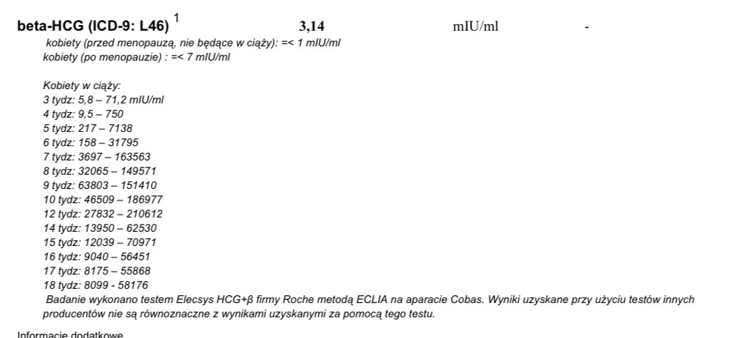 Witam. W załączniku przesyłam wyniki Beta HCG. Stosunek z którego ewentualnie mogłoby dojść do zapłodnienie odbył się 2 tygodnie temu. Natomiast zastanawia mnie wynik 3,14, normy dla kobiet niebędących w ciąży to <=1. Rozumiem, że w ciąży nie jestem, ale dlaczego wynik jest większy niz 1? Czy ewentualnie jest jakaś szansa że Beta wzrośnie?