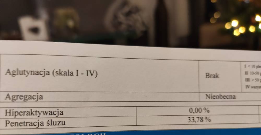 Dziękuje za odpowiedź. 1 stopień to właśnie znaczy, że jest mało zalepionych plemników, więc dobrzeJest okna lepszy ruch można pić l-karnityne. Spytajcie lekarza o tą pić aglutynacja 1 stopnia. To ozn. że plemniki zlepiają się ze sobą.