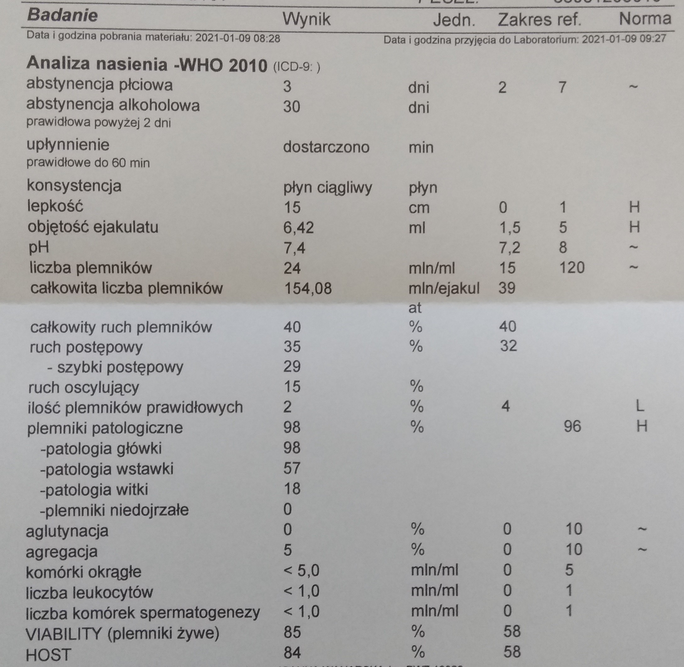 żywotność 61%, 84,9 mln/ejakulat (>58%, >22,6 mln/ejakulat)