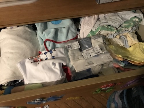 Ubranka dla Wandzi posegregowałam do 3 szuflad 0-3, 3-6 i >6 miesięcy - teraz tylko trzeba będzie poprać (kiedyśtam) i wyselekcjonować to co będę ze sobą brała do szpitala. Jeden blat chwilowo poświęciłam też na rzeczy z kategorii "higieniczne": podkłady, wkładki, majtki, kosmetyki, Water Wipes, pampersy, aniball, laktator, butelki, smoczki i inne podobne (matko ile miejsca to objętościowo zajmuje!)- efekt jest taki, jak byśmy byli w trakcie remontu