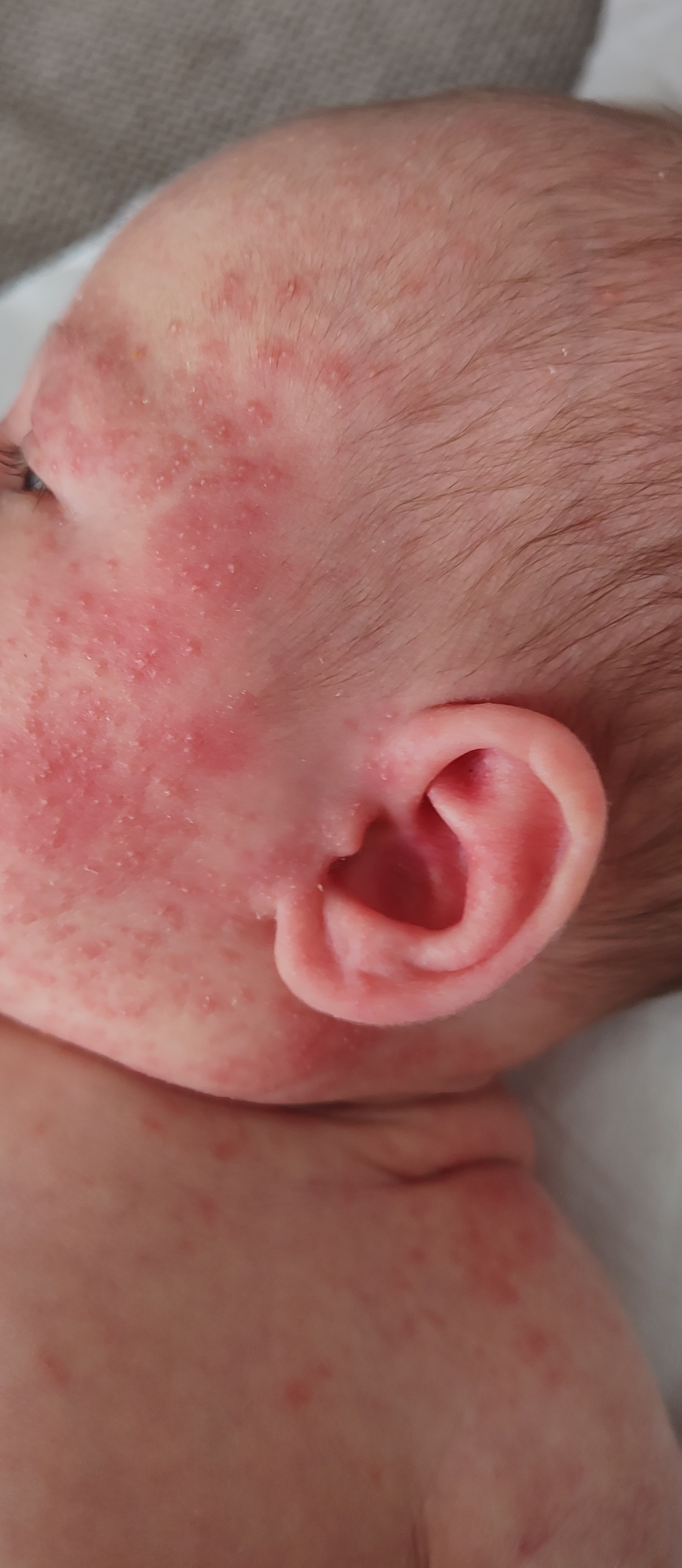 Hej, czy któraś mama miała podobną wysypkę u swojego dziecka? Dziecko dostało wysypki w 4. Tygodniu życia, jest głównie na twarzy ale rozprzestrzenia się na szyję i klatkę piersiową. Czy ktoś jest w stanie stwierdzić czy to trądzik czy alergia?