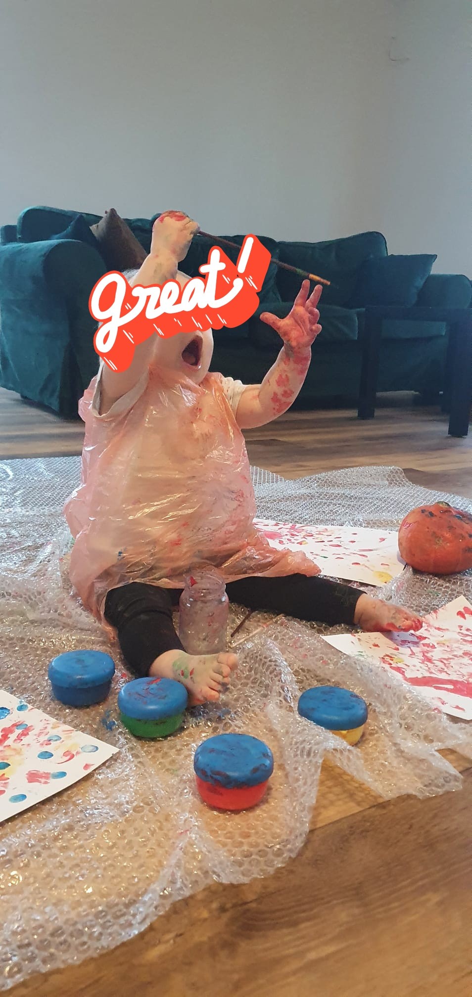 Haha Kochana to worek na śmieci z dziurami na głowę i rączki, bo fartuszek z ikei akurat w praniuAle czad!!!! Podlinkujesz re farbki? Może i my spróbujemy. Fajny ciuszek zabezpieczający dziecko![]()