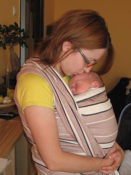 mata-kow, ja niestety mam tańszą, Azimi, i to nie był dobry pomysł. Materiał sztywny, pościelowy, ale nie korzystaliśmy z niej zbyt często. Przydawała się na wakacjach i jak Tośka była malutka (kiedy płakała i nie dało jej się uspokoić, to ją wiązałam i po chwili spała). Jeśli kogoś stać, to lepiej kupić od razu droższą, mięciutką chustę, a później i tak się część kosztów zwróci przy sprzedaży