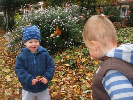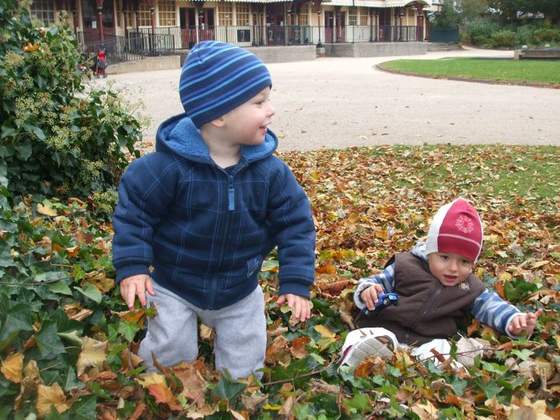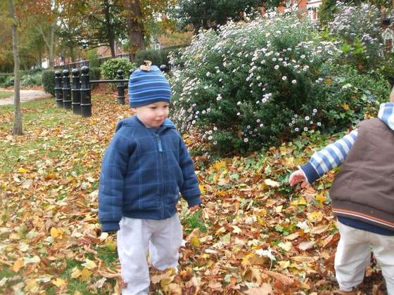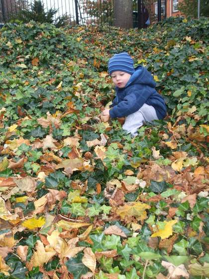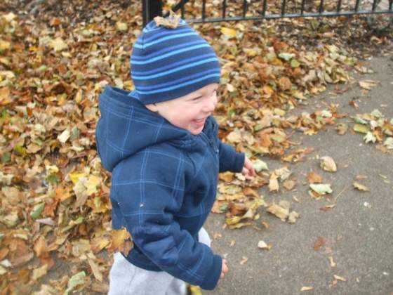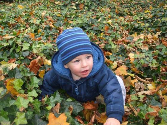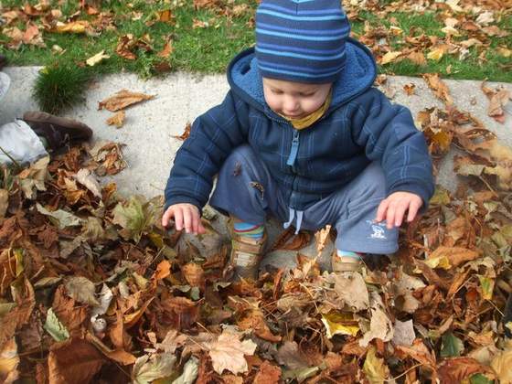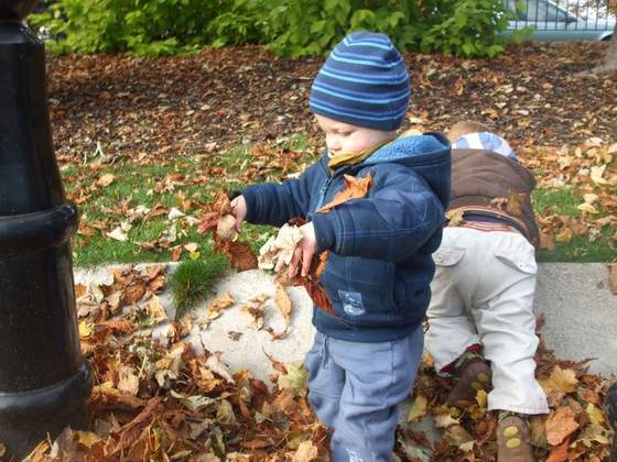 i widać, że polubił zabawę w liściach.
