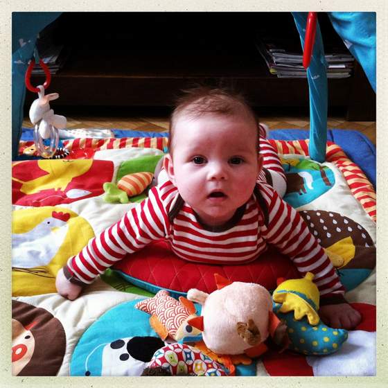 . Ale nigdy nie opieram go o coś (poduszka, oparcie kanapy itp.), tylko zawsze jest podtrzymywany albo pod boczki albo pod brzuch a plecy ma oparte o mój brzuch - i taką też pozycję zaleciła mi pani rehabilitantka na wizycie w tamtym tygodniu. Okazało się, że przypadkiem go dobrze trzymam w pozycji siedzącej