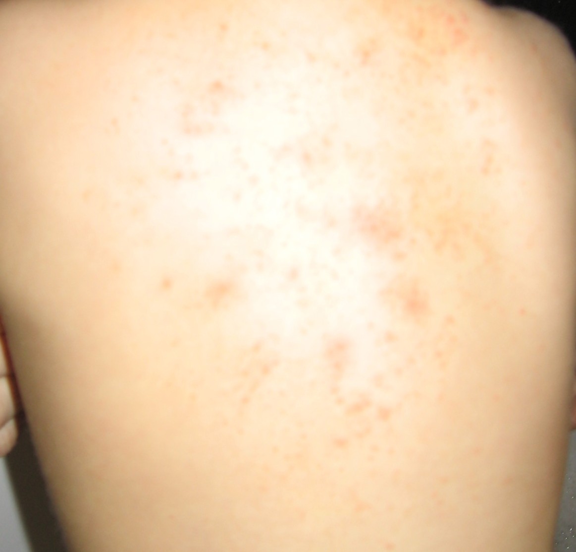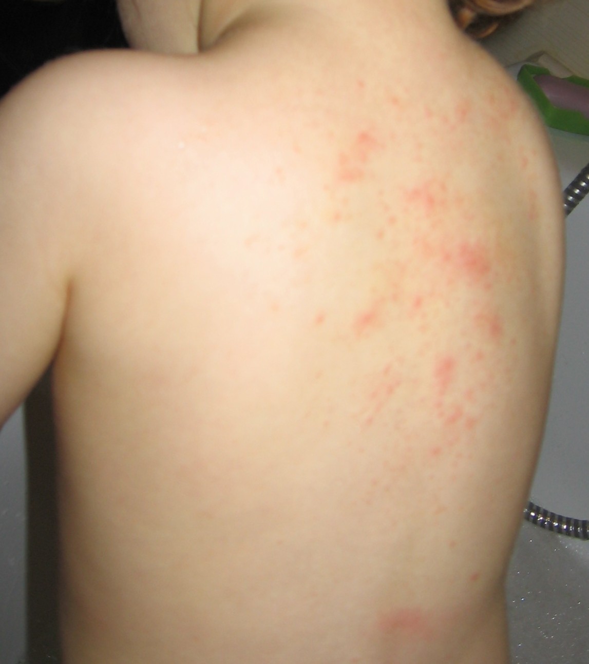 Nie zmieniliście ostatnio proszku do prania? Od czekolady to raczej nie jest, może się od niej tylko zaostrzać... A kiedy ostatni raz mieliście antybiotyk i jaki? Spróbuj przypomnieć sobie kiedy się zaczęła i pokojarzyć, może z lekiem, antybiotykiem, może jakaś farba w nowym mieszkaniu, coś takiego... Potówki to raczej na karku i wyżej, a tutaj wyraźnie na całych pleckach ogniska. A to wysypka drobna, czy podchodzi płynem surowiczym?